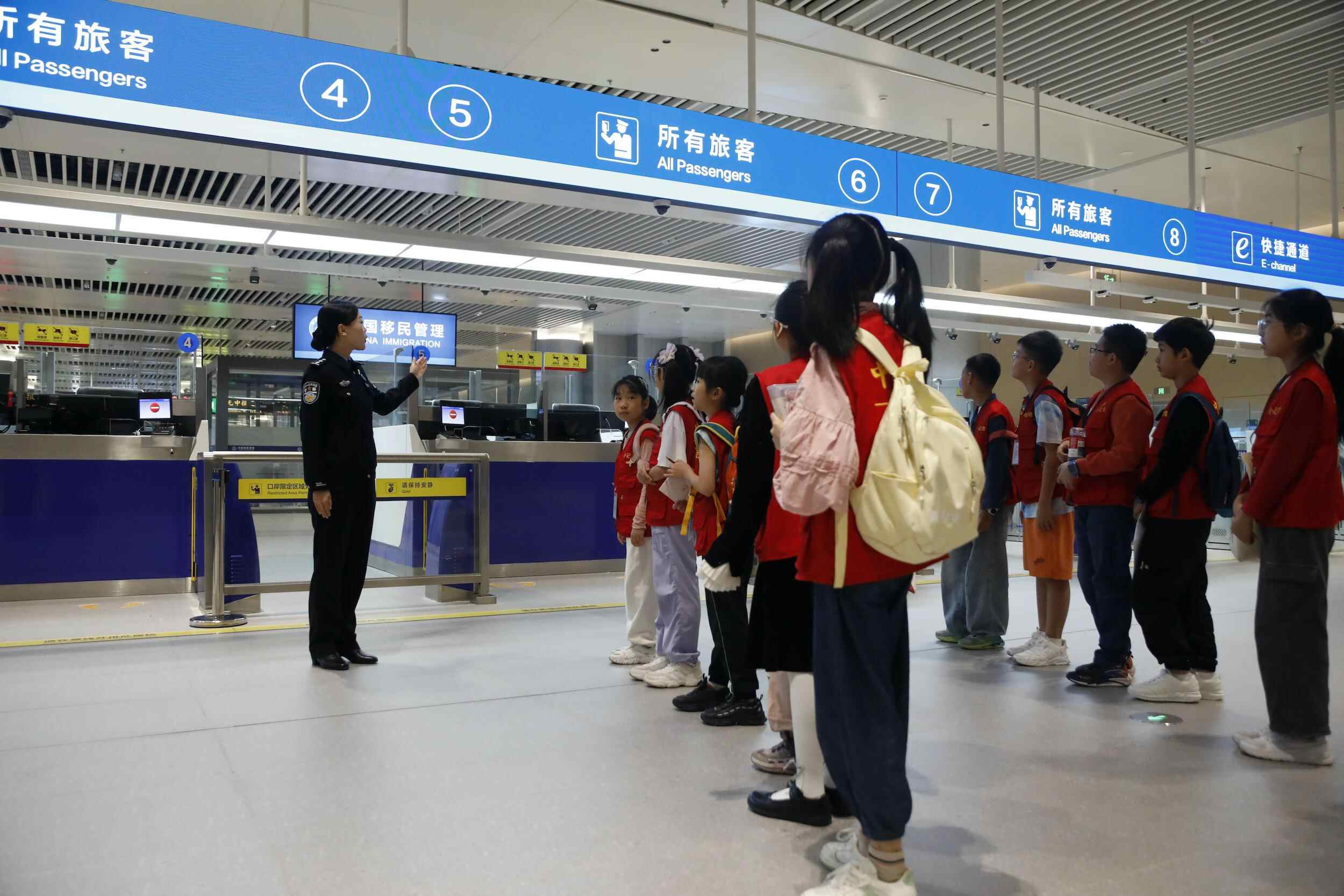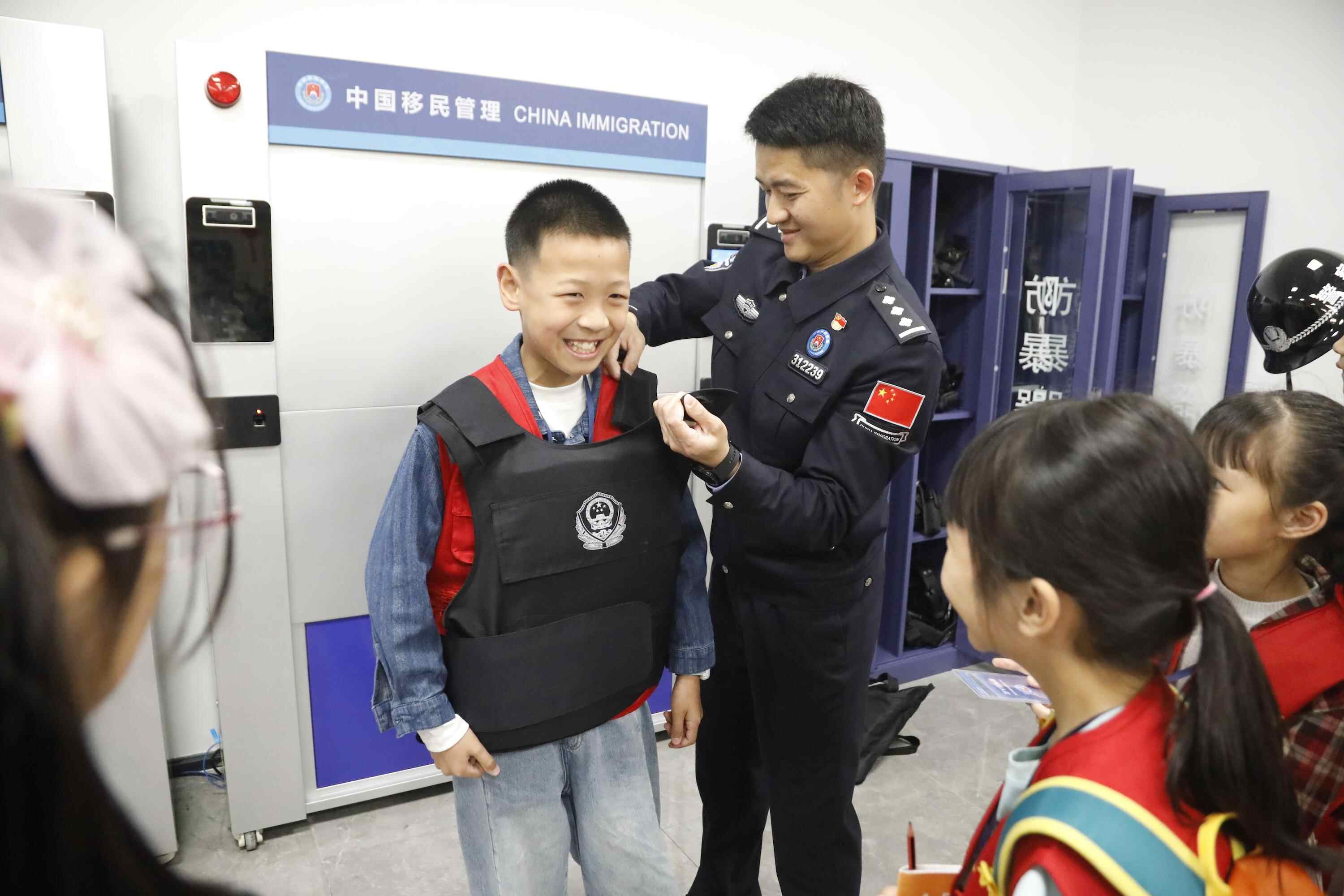活动现场,小学生们在移民管理警察的带领下,先后参观了新口岸出境大厅、码头泊位及入境大厅,现场体验穿戴警用装备。移民管理警察通过生动讲解,向小学生们演示了出入境查验的流程,并介绍了智能验证台、生物识别系统等高科技设备的应用。一位小学生感慨道:“原来每一本护照的核验都关乎国家安全,移民管理警察的工作真了不起!”