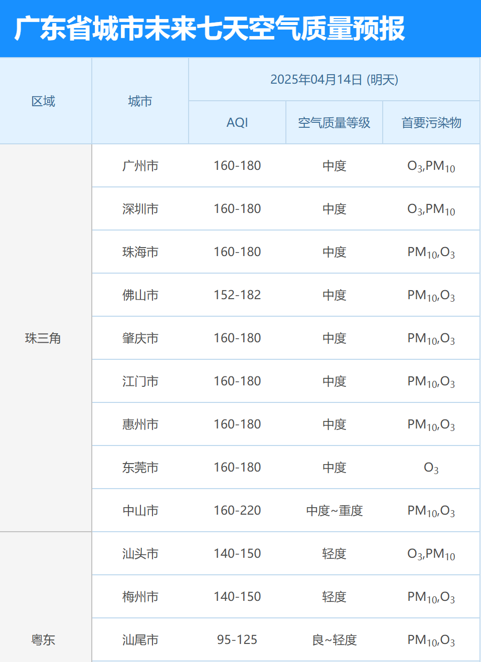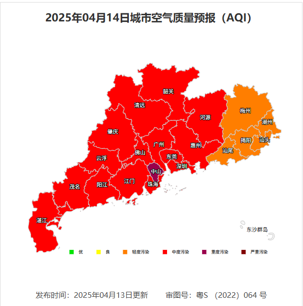 粤东、粤西、粤北:4月14-20日,空气质量优至良为主,其中14-16日,受风场辐合和北方沙尘影响,大部分地市良至轻度污染。
