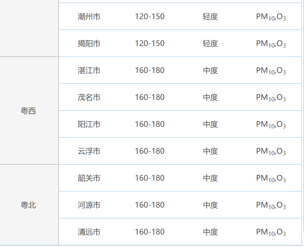 根据广东省环境监测中心预测,珠三角地市或将从16日起有较明显改善,粤东、粤西、粤北地市或将从14日起改善。广东各地未来几日空气质量状况如下: