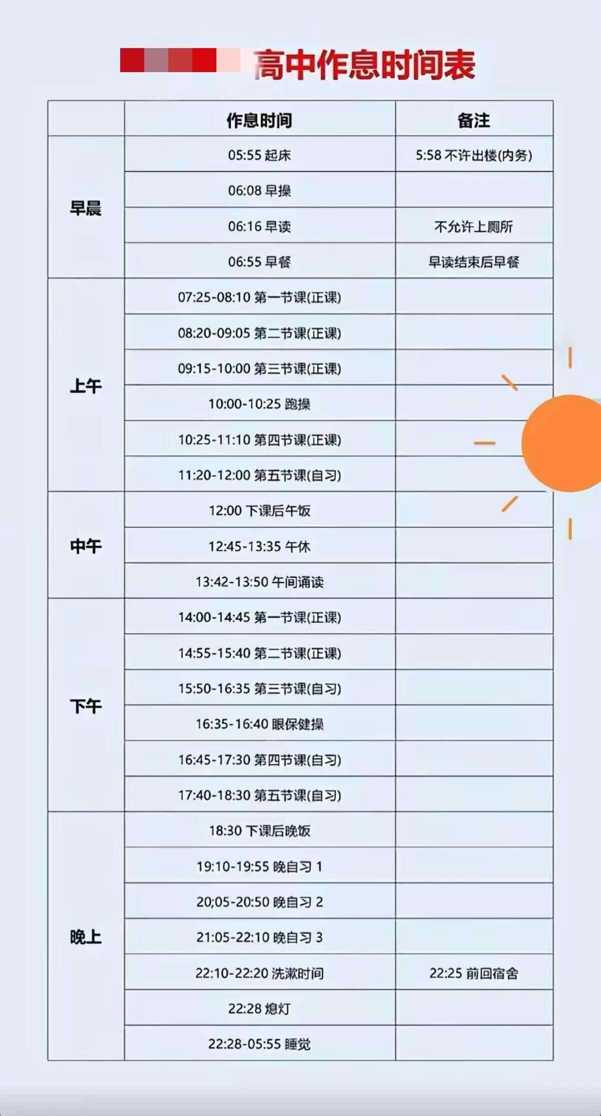高中阶段,升学压力迫切地摆上台面,落在师生身上变成了见缝插针的作息安排。多位受访者能一口气把高中一天的作息从头到尾背出来,从早上6点左右到晚上10点前后,中间约16个小时,密密麻麻穿插着上课、考试与自习。