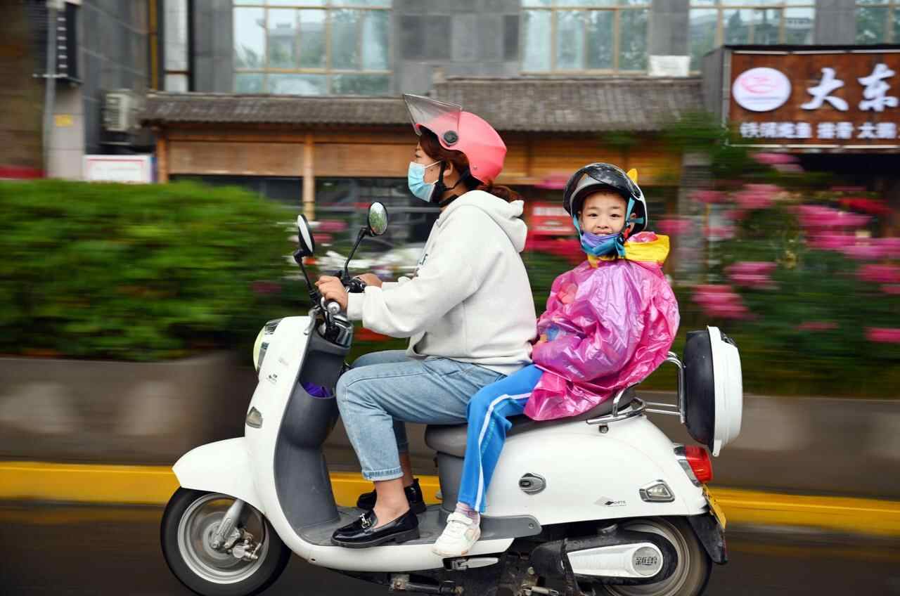 放学后,家长骑着电动自行车带孩子回家 来源:新华社