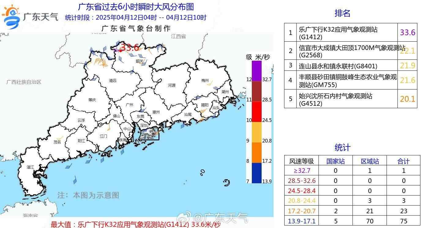 据气象监测,12日4时到12日10时,超过10.8米/秒站点占全省总站数的14.3%,有1个气象站录得超过32.7米/秒的12级风,有3个气象站录得20.8米/秒~24.5米/秒的9级风,有21个气象站录得17.2米/秒~20.8米/秒的8级风,风力较大的站点有:韶关乐昌市大源镇33.6米/秒、茂名信宜市大成镇22.1米/秒、清远连山壮族瑶族自治县永和镇21.9米/秒、梅州丰顺县大龙华镇21.6米/秒。