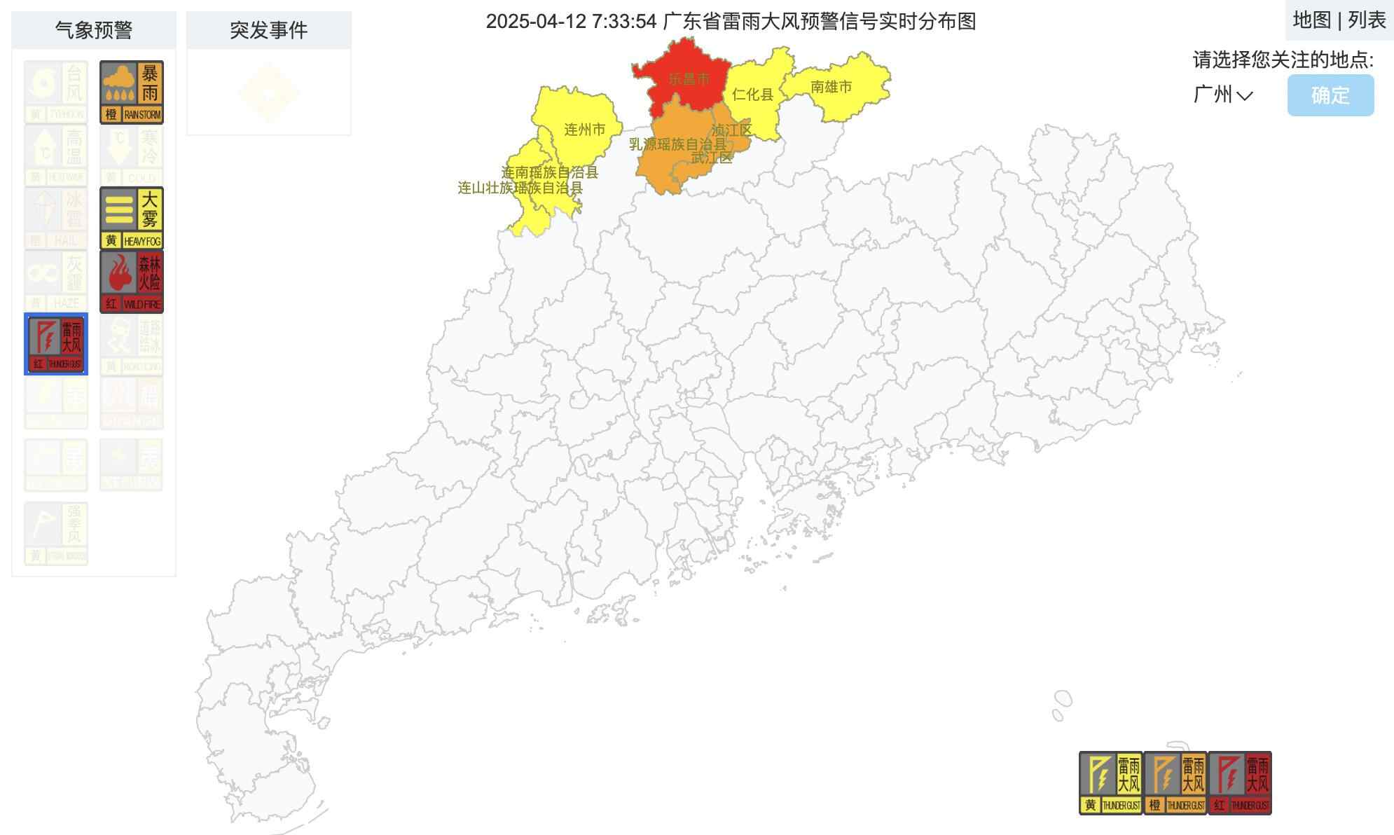 截至4月12日9时05分,河源市和平县、连平县,韶关市曲江区、始兴县、南雄市翁源县先后发布雷雨大风橙色预警信号。据@广东天气 预报,12日,广东大部有8~10级局地12级的雷雨大风,部分市县有短时强降水、局地冰雹等强对流天气,中北部市县阴天,有大雨到暴雨局地大暴雨,其余市县多云到阴天,有中到大雨局地暴雨。最低气温:粤北市县10~14℃,粤西沿海市县18~22℃,其余市县14~18℃。