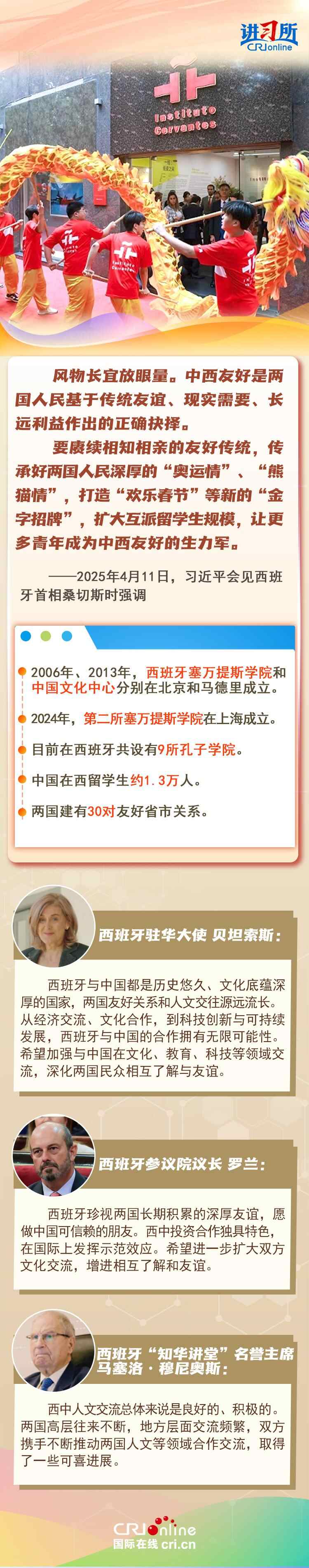 今年是中西全面战略伙伴关系建立20周年,也是中欧建交50周年。多年来,中西两国领导人保持密切互动,秉持互尊互信、互利共赢精神,两国在深化贸易、投资、科技创新、绿色能源等领域取得丰富合作成果,双边关系走在中国同欧洲国家关系前列。在西班牙人士眼中,良好的对华关系对西班牙、欧洲和世界具有重要意义,将会为两国人民带来更多实实在在的福祉,也将共同创造更美好的未来。