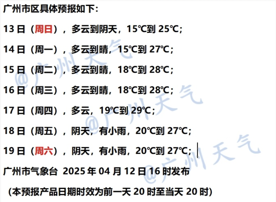 广州市气象台12日预计,13日至17日广州转多云到晴天气,市区白天日最高气温逐渐回升至28~29℃;但早晚稍微清凉,预计13日至17日广州市区日最低气温逐渐从15℃升至19℃。按现有气象资料展望,18日起广州又有一次切变线影响过程,天气或再转不稳定。