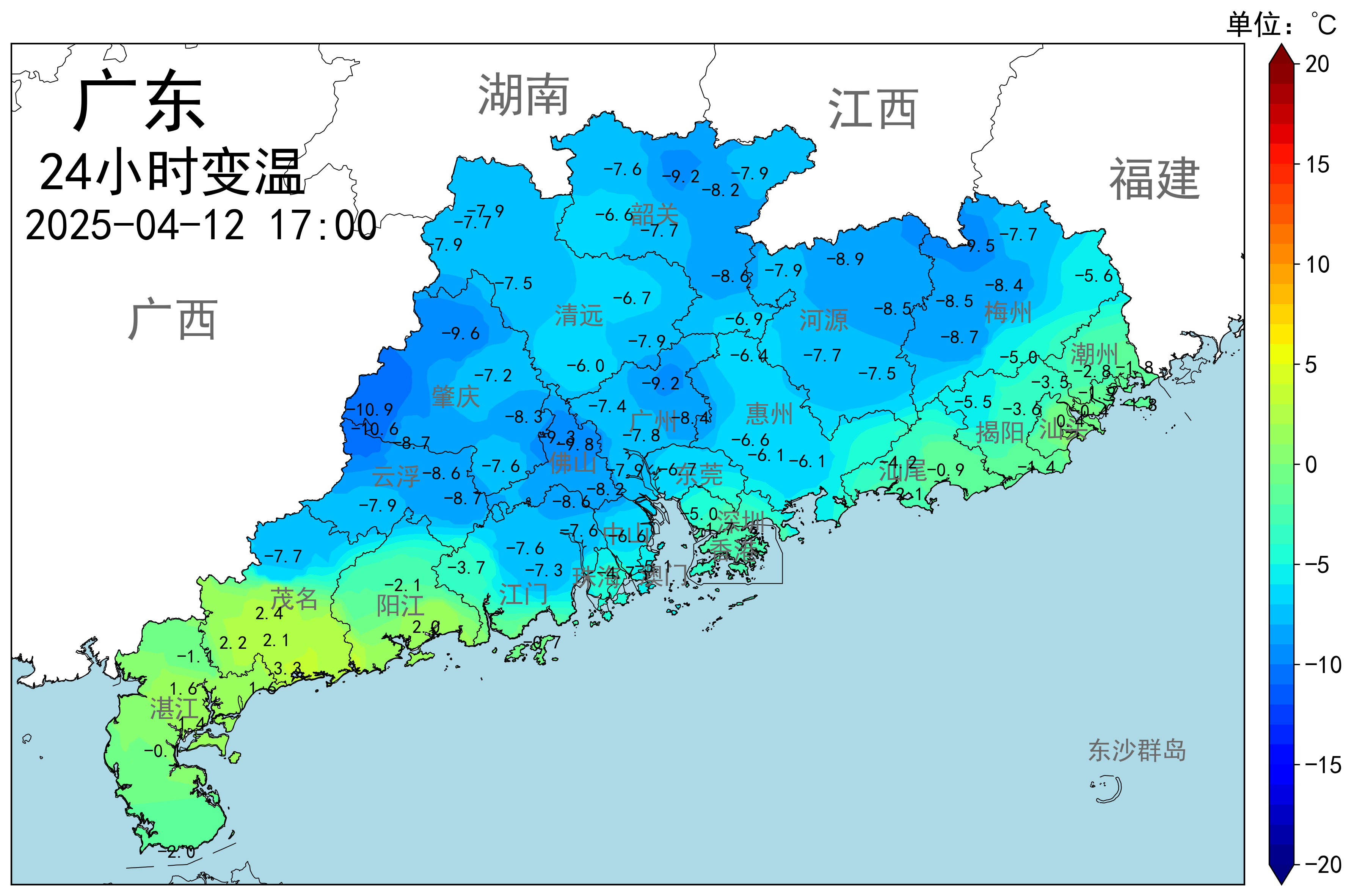 在冷空气影响下,截至12日17时,除东部及西部沿海市县外的广东大部分市县,普遍录得超过5℃的同比降温;有的市县降温明显,如广州范围内各国家基本气象站点同比降温幅度在7.4~9.2℃,梅州、韶关、佛山、肇庆等地,也出现了降温幅度超过9℃乃至10℃的国家基本气象站点。