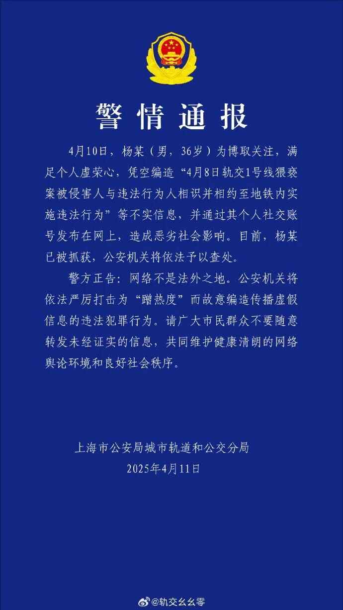 4月11日,上海市公安局城市轨道和公交分局发布通报称,4月10日,杨某(男,36岁)为博取关注,满足个人虚荣心,凭空编造“4月8日轨交1号线猥亵案被侵害人与违法行为人相识并相约至地铁内实施违法行为”等不实信息,并通过其个人社交账号发布在网上,造成恶劣社会影响。目前,杨某已被抓获,公安机关将依法予以查处。