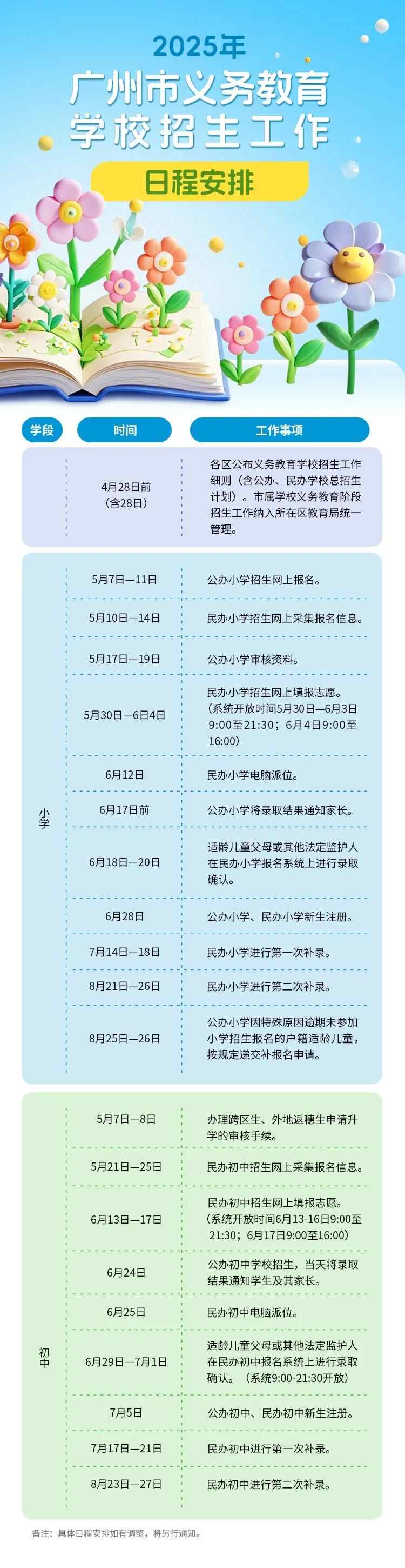 4月11日,2025年广州市义务教育学校招生工作日程安排公布。