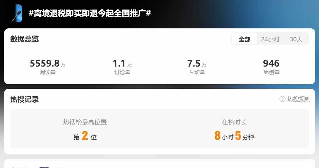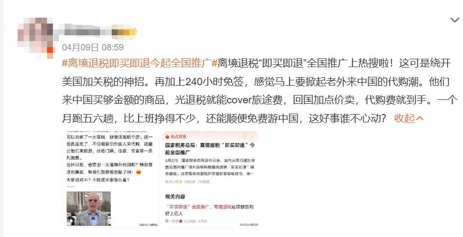 该消息迅速引发网络舆论的广泛关注和讨论。截至4月11日15时,微博话题#离境退税"即买即退"今起全国推广#阅读量达到5500万,相关讨论超1.1万条。