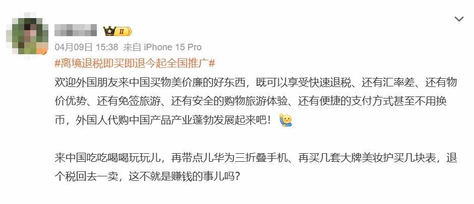 还有网友通过社交媒体平台向境外游客表示欢迎:“欢迎外国朋友来中国买物美价廉的好东西,既可以享受快速退税,还有汇率差、物价优势、免签旅游、安全的购物旅游体验、便捷的支付方式甚至不用换币,外国人代购中国产品产业蓬勃发展起来吧!”