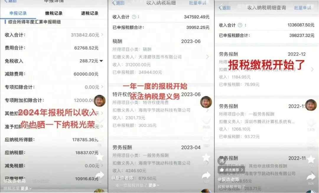 4月11日,“反诈老陈”在视频中公布了2024年的总收入。根据其晒出的“个人所得税”APP页面显示,他去年收入约为31.38万元,与2023年约34.7万元的收入相比有所下降,较2022年133万多元的总收入,下降了超100万元。