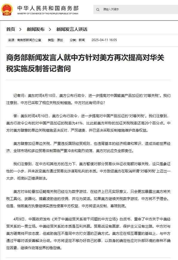 记者问:美东时间4月10日,美方公布行政令,进一步提高对中国输美产品加征的“对等关税”。我们注意到,中方已采取了相应关税反制措施。中方对此有何评论?