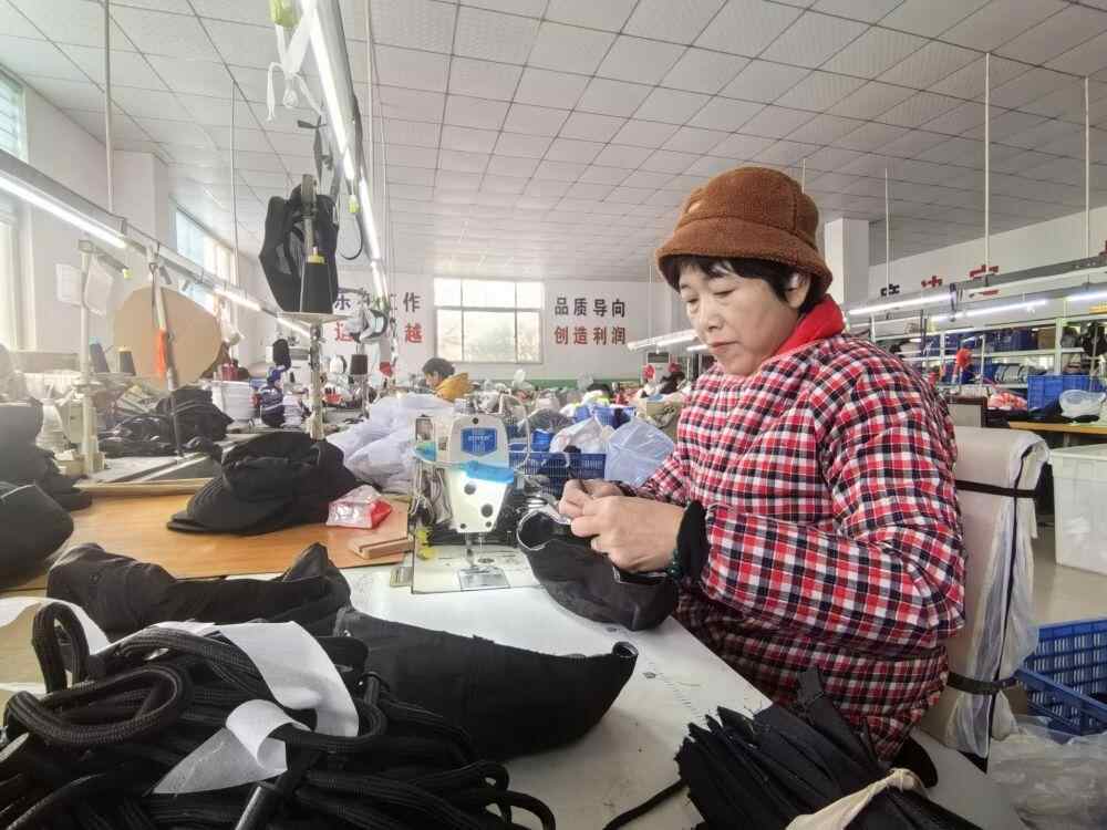 青岛金丰盛泽帽业有限公司的生产车间里,制帽工人们在赶制订单。新华社记者 王欢 摄