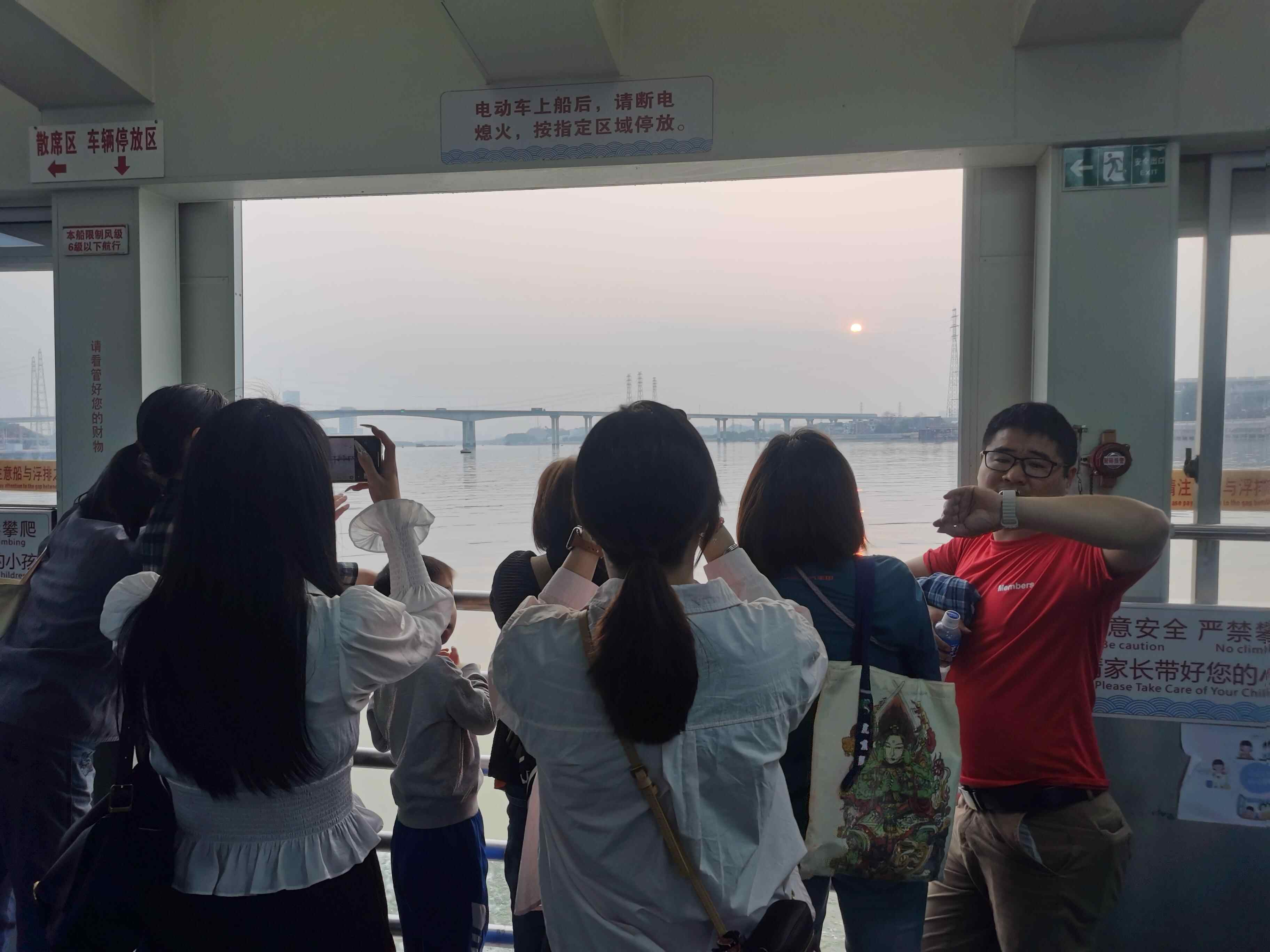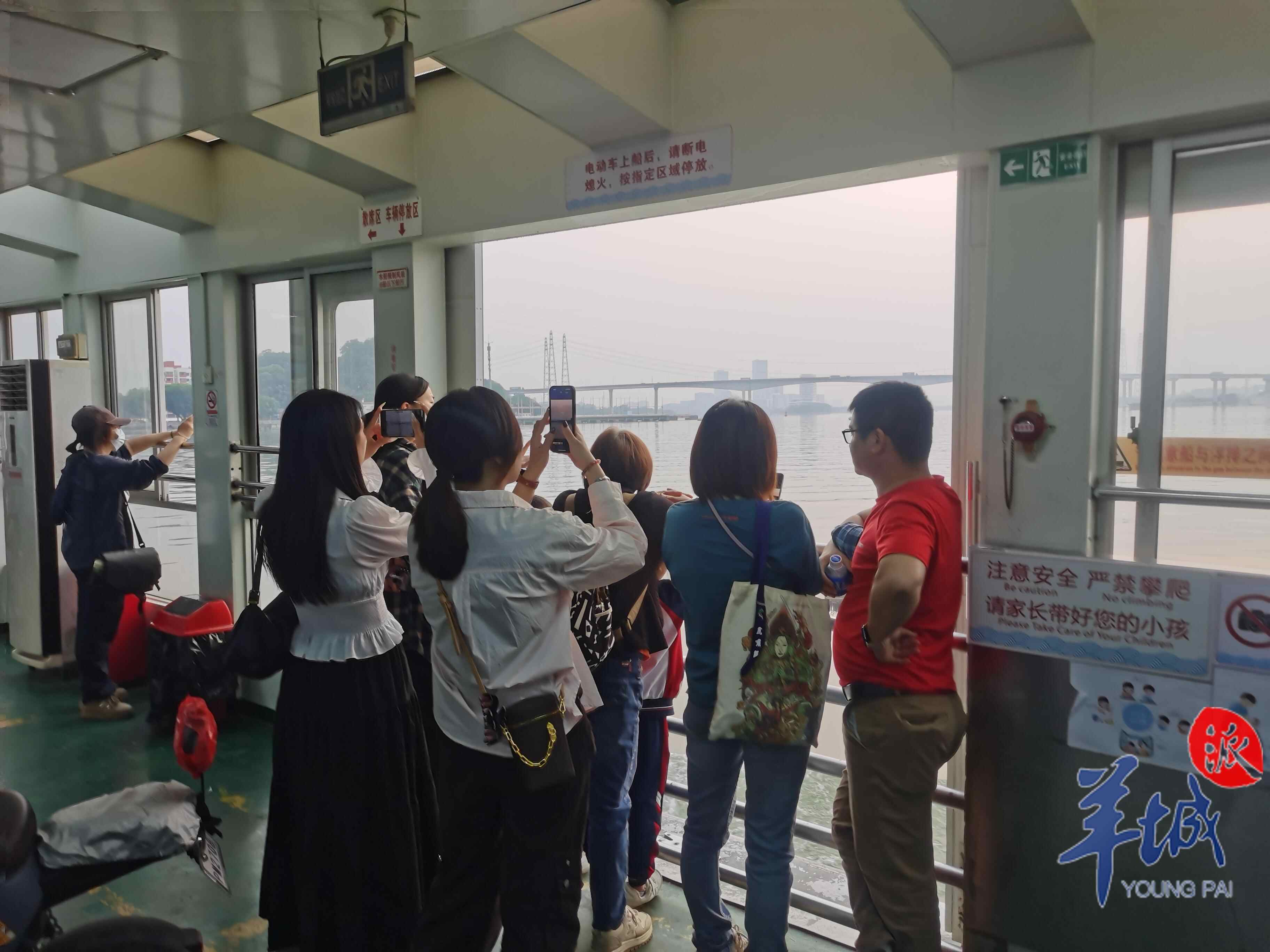 4月8日傍晚,广州的天气并不十分晴朗,淡淡的夕阳时隐时现。尽管如此,从新洲驶向深井轮渡上的乘客,仍然聚在舱门处拍照。一名工作人员也忍不住起身,久久地注视夕阳。他告诉羊城晚报记者,目前该航线上下班时段乘客往往超过40人,而在其他时段则不足10人,有时甚至只有两三人。