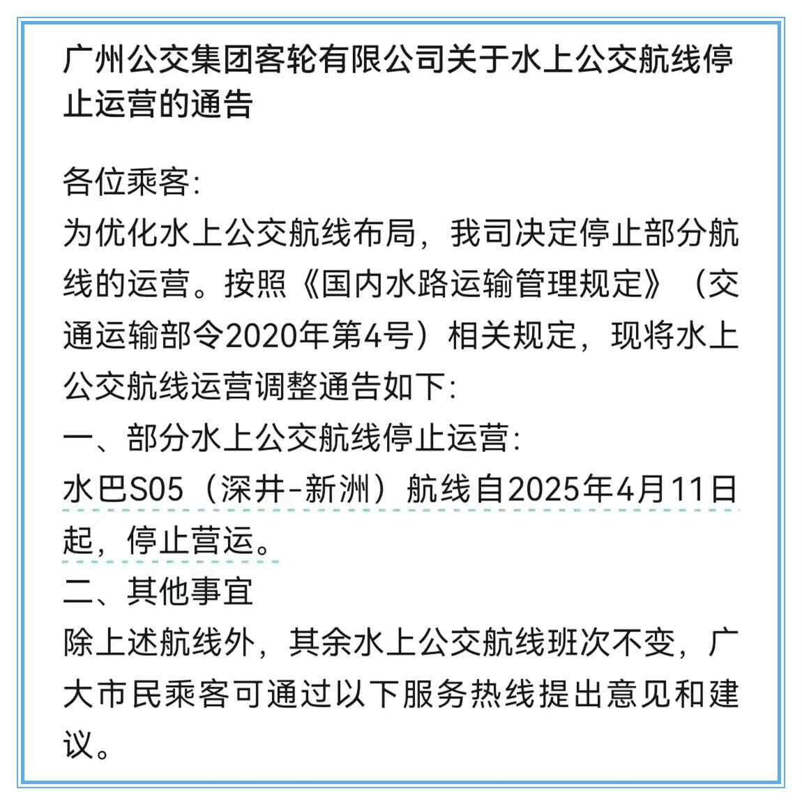 然而,随着生产生活与交通方式的变迁,轻舟快桨渐成记忆。根据广州公交集团客轮有限公司通告,明天起,深井-新洲轮渡将停止运营。这意味着,连接黄埔长洲与海珠新洲数十年的水上巴士将从此消失。而一度纵横交错、遍布河道的广州水巴线路,也将仅余3条。