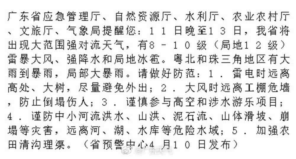 为提醒公众防御强对流天气,广东省应急管理厅、自然资源厅、水利厅、农业农村厅、文旅厅、气象局已在4月10日上午,通过广东省突发事件预警信息发布中心陆续向全省(含漫游)手机用户发送短信,提醒公众11日晚起广东将出现大范围强对流天气,其影响过程除12日外还有可能持续至13日,建议公众在雷电时远离高处、大树,尽量避免外出;大风天气时远离工棚危墙,防止倒塌伤人;强对流天气影响期间谨慎参与高空和涉水游乐项目;谨防中小河流洪水、山洪、泥石流、山体滑坡、崩塌等灾害,远离河、湖、水库等危险水域;加强农田清沟理渠。