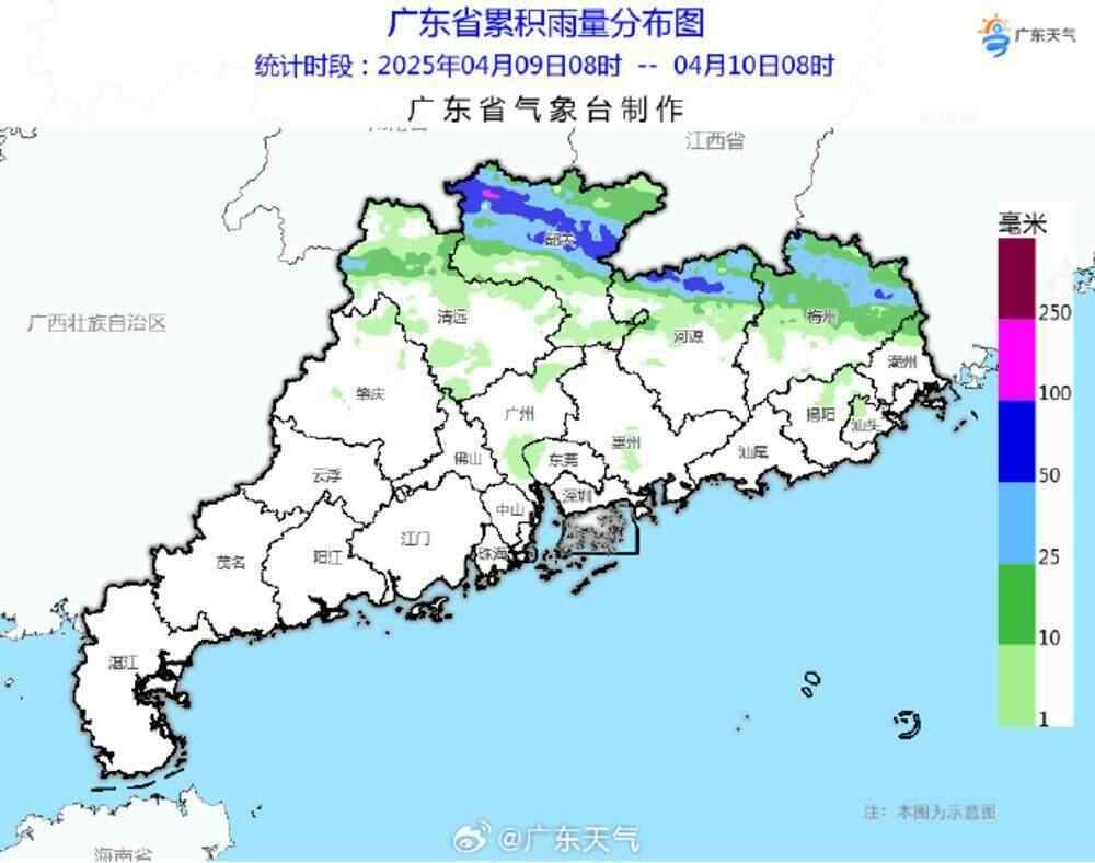 根据广东省气象部门监测,4月9日夜间到10日早晨,清远、韶关、河源、梅州的偏北市县等地已受到降水影响,其中韶关乐昌24小时最大累积雨量超过100毫米。