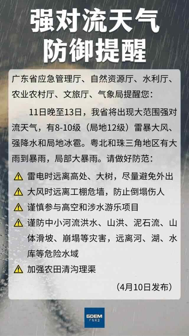 据气象部门预测,4月11日夜间至12日,广东有一次大范围强对流过程,伴有8-10级局地12级雷暴大风、短时强降水。对此,4月10日,广东六部门联发强对流预警,提醒市民群众做好防御。