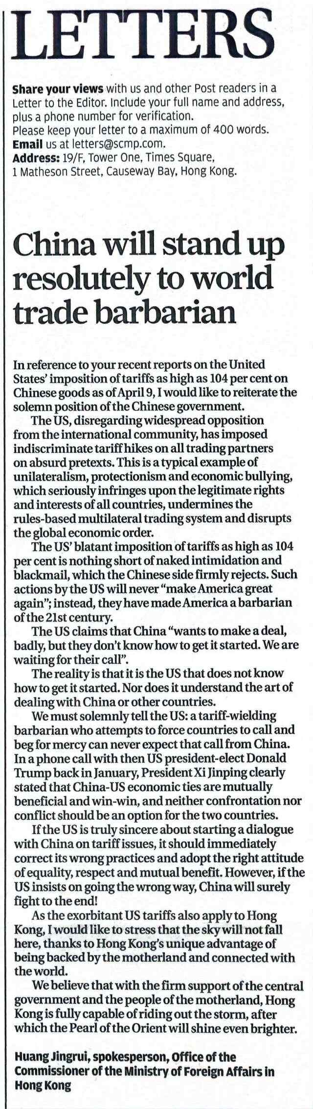 4月9日,外交部驻港公署发言人就美国对华加征严重不合理关税致信《南华早报》,阐明中方严正立场。该信于4月10日在《南华早报》及其网站发表。全文如下: