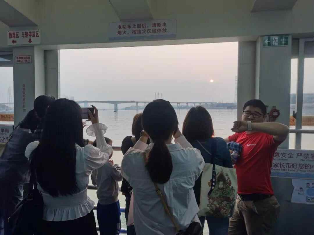 4月8日傍晚,广州的天气并不十分晴朗,淡淡的夕阳时隐时现。尽管如此,从新洲驶向深井的轮渡上的乘客,仍然聚在舱门处拍照。一名工作人员也忍不住起身,久久地注视夕阳。他告诉羊城晚报记者,目前该航线上下班时段乘客往往超过40人,而在其他时段则不足10人,有时甚至只有两三人。