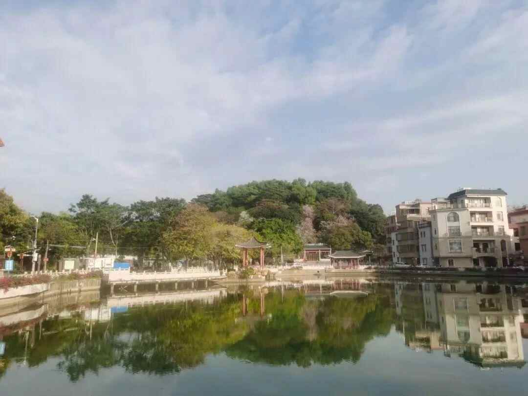 从深井码头入村,行两三百米即可见到一大片荷塘,青山白桥与亭台楼阁倒映其中,令人不禁心醉。由此入山拾级而上,十分钟便可登临山顶。独立二层亭子上,东可俯视珠江,不时能见到轮渡蜿蜒来去;西可远望大学城,天气好时还能看到广州塔。古朴村落与摩天大楼,在这里只有一江之隔。