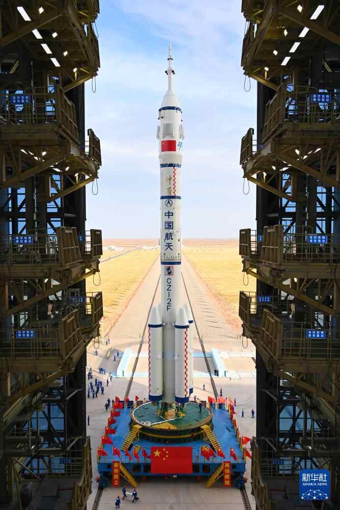 4月16日,神舟二十号载人飞船与长征二号F遥二十运载火箭组合体在垂直转运中。新华社发(汪江波 摄)