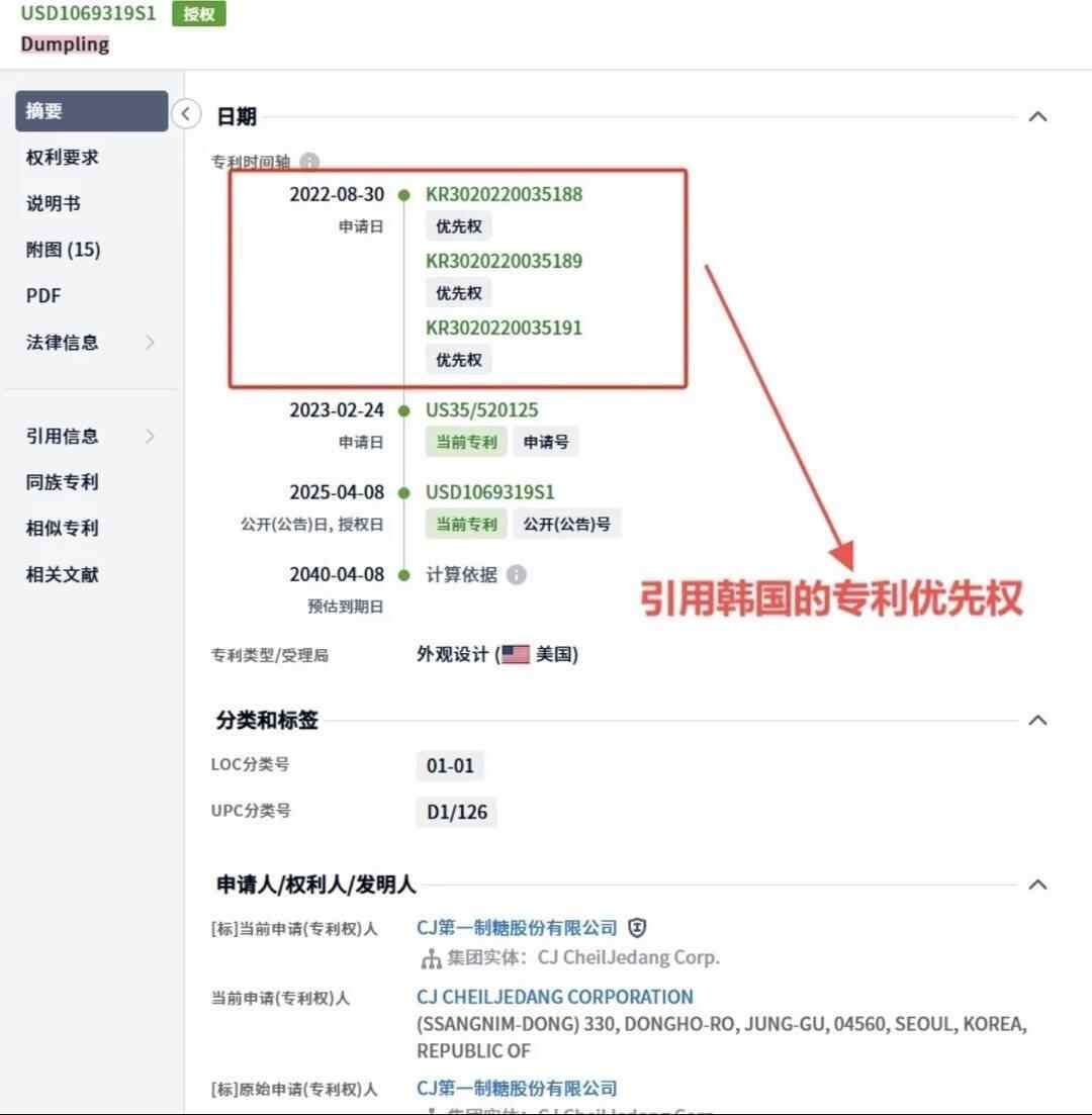 青枫(广州)管理咨询有限公司主营企业海外的知识产权代理申请,16日封面新闻采访了市场总监钟健龙,他表示,从公示文件中可以看到,在美国申请饺子的外观专利时,是引用了韩国的专利优先权,即先在自己国家申请专利,再到国外申请专利。“CJ公司分别在日本、韩国、美国及世界产权组织都注册了名为‘饺子’的外观专利。”