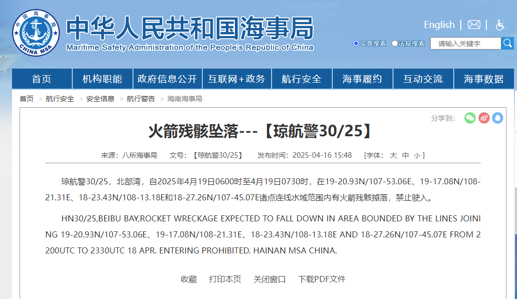 航行警告:北部湾部分水域有火箭残骸掉落,禁止驶入