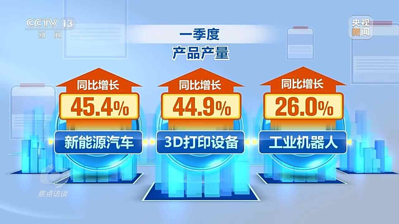 人工智能等前沿技术带动高端制造快速发展。一季度,新能源汽车、3D打印设备、工业机器人产品产量同比分别增长45.4%、44.9%、26.0%。