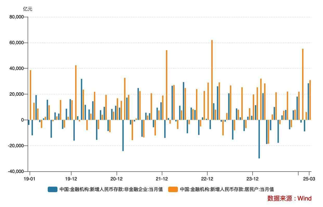 从央行数据来看,经历了去年的大幅波动,今年以来,银行业存款开门红取得了完美收官。今年3月,国内金融机构人民币存款增长4.25万亿元,同比少增5500亿元,其中住户存款增加3.09万亿元,同比多增2600亿元;非金融企业存款多增2.84万亿元,同比多增7675亿元;财政存款减少7710亿元,同比少增49亿元;非银存款减少1.41万亿元,同比少增12610亿元。