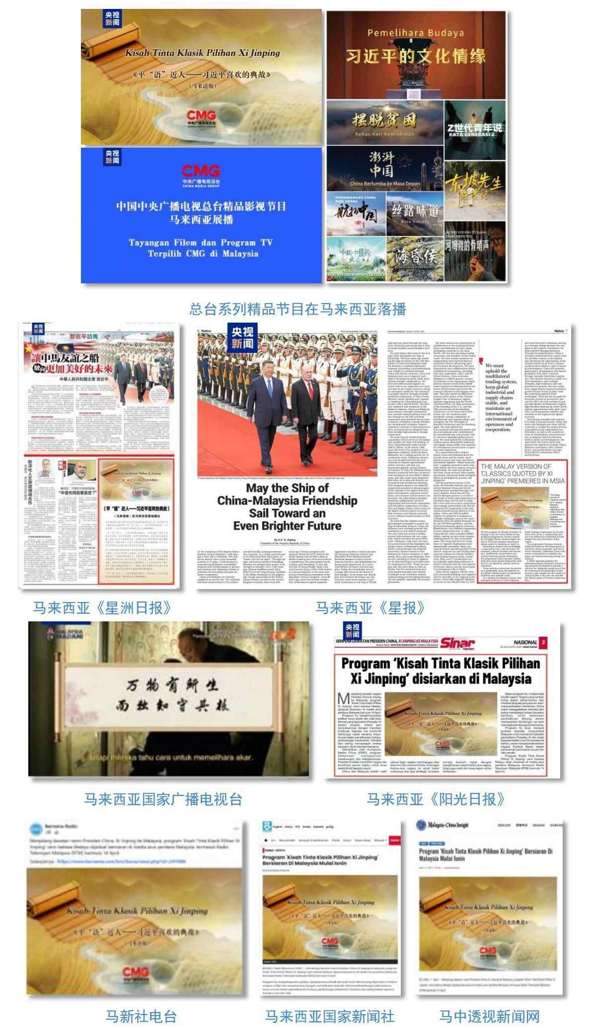 精品展映。习主席访马之际,《平“语”近人——习近平喜欢的典故》(马来语版)在马来西亚国家广播电视台等主流媒体落地播出。马来西亚《星洲日报》《星报》《阳光日报》、马新社电台、马中透视新闻网等当地主流媒体对节目进行报道。《习近平的文化情缘》《摆脱贫困》《澎湃中国》等总台精品节目也陆续在马来西亚国家新闻社、寰宇电视台、阿尔西吉拉电视台、8TV电视台等多平台播出。