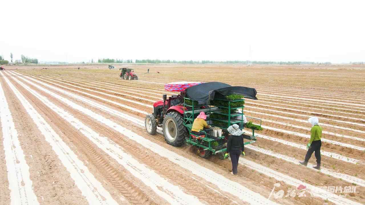 4月10日,伽师县和夏阿瓦提镇色满村辣椒基地机械轰鸣,辣椒移栽机沿着规划好的田垄,精准有序地进行辣椒移栽作业 。伽师县融媒体中心供图