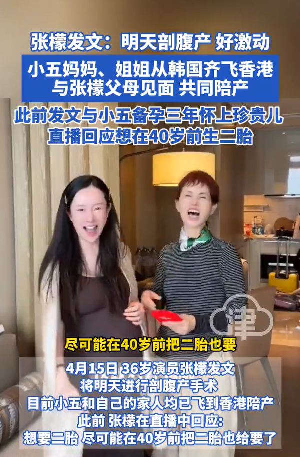 4月15日,张檬在社交平台上发视频分享两家人到港陪同待产,“明天剖腹产,有点小兴奋有点小激动!终于要见面了!” 据悉,张檬金恩圣(小五)备孕三年迎来试管宝宝。此前,张檬在直播中回应:想要二胎,尽可能在40岁前把二胎也给要了。
