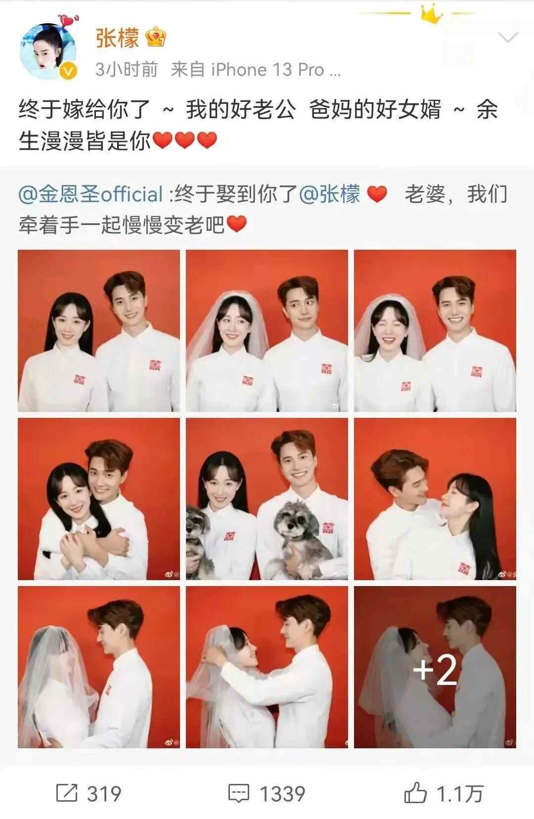 2022年2月10日,@金恩圣official 宣布与@张檬 结婚,写道“终于娶到你了,老婆,我们牵着手一起慢慢变老吧”,张檬转发表示“终于嫁给你了”。照片中,金恩圣掀起张檬的头纱,两人抱着爱宠,笑得超甜。