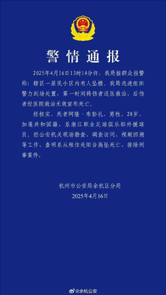 4月16日晚,@余杭公安 通报效力于中超浙江足球俱乐部的前锋布彭扎的相关情况,称布彭扎从租住处阳台高坠死亡,排除刑事案件。