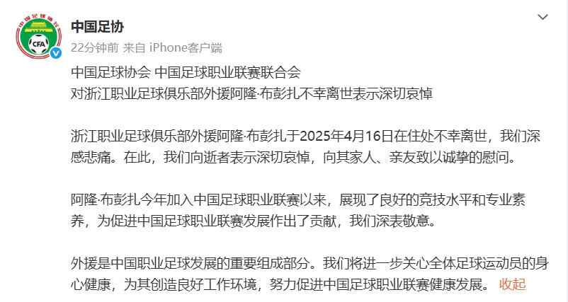 4月17日,@中国足协 发文回应阿隆·布彭扎离世,内容如下: