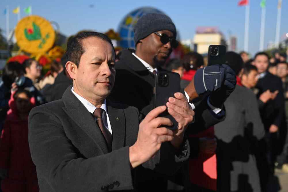 来自尼泊尔的客商(左)在义乌国际商贸城观看开市仪式的舞龙表演(2025年2月9日摄)。新华社记者 黄宗治 摄