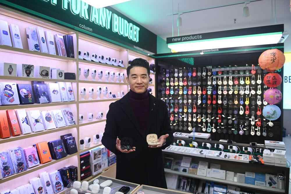 2025年2月9日,在浙江义乌国际商贸城,一家商铺负责人展示一款热销海外的AI智能穿戴设备。新华社记者 黄宗治 摄