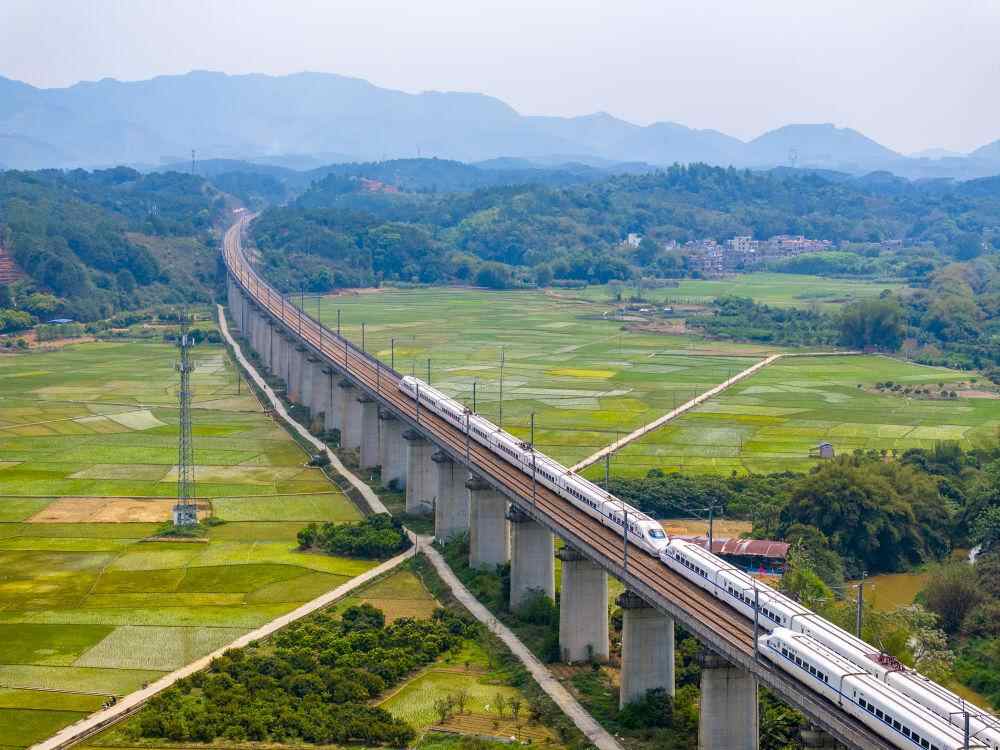 4月8日,动车组在广西梧州市龙圩区龙圩镇念村境内行驶(无人机照片)。新华社发(何华文摄)