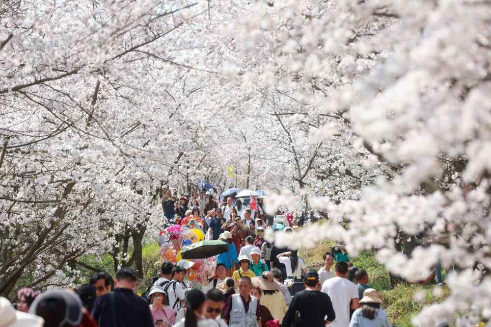 3月25日,游客在贵州省贵安新区樱花园内赏花。新华社记者 刘续 摄