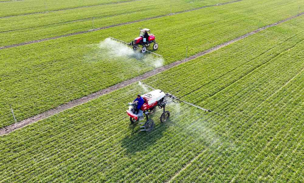 2025年2月18日,在安徽省亳州市谯城区赵桥乡一处麦田,农民驾驶农机开展田间管理(无人机照片)。新华社发(刘勤利 摄)