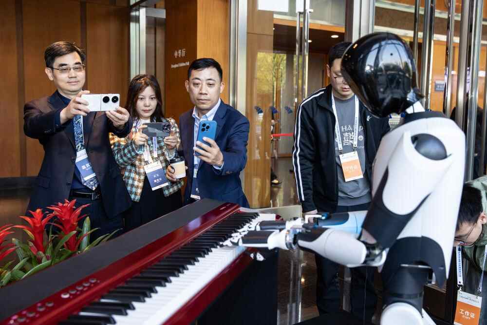 在南京举行的2025产业科技创新与投资促进大会展示区,嘉宾在拍摄机器人弹钢琴(2025年3月26日摄)。新华社发(张梦 摄)