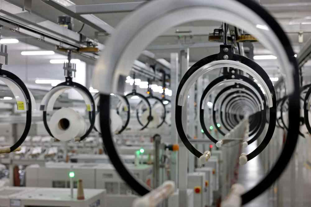 4月15日,在山东枣庄经济开发区一企业无人“智慧纺纱”车间,智能化生产线在加工高端纱线。新华社发(孙中喆摄)