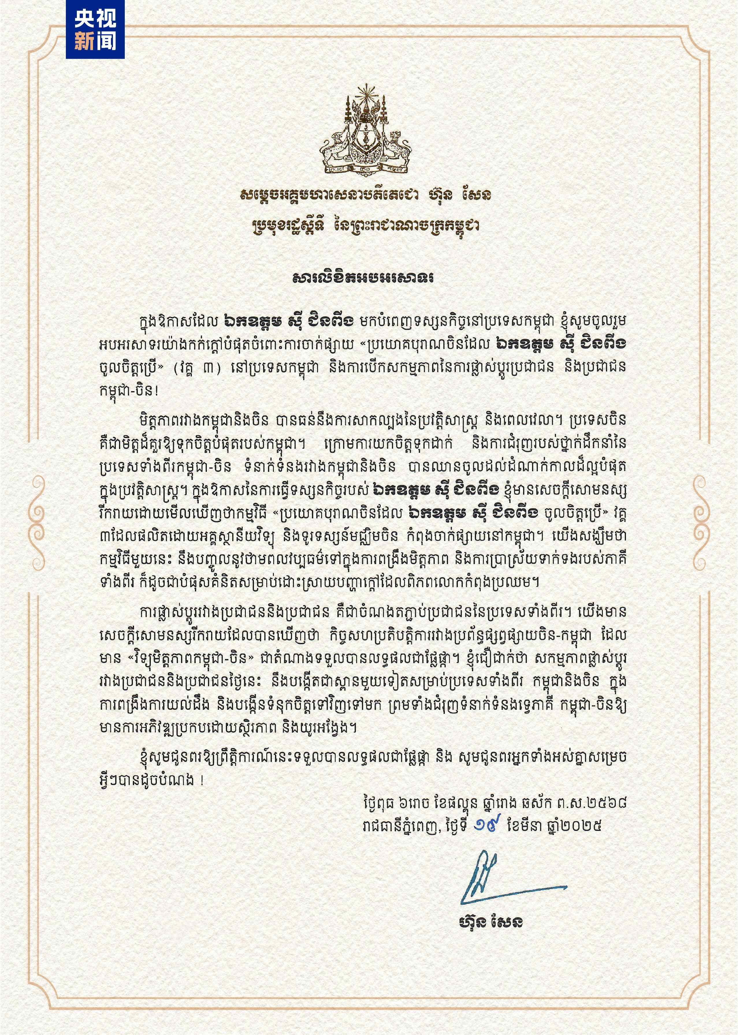 洪森在贺信中表示,在柬中双方领导人的关心和推动下,两国关系进入历史最好时期。希望中国中央广播电视总台制作的《平“语”近人——习近平喜欢的典故》(柬埔寨语版)在柬的成功播出,能为推动双方相知相亲注入深厚持久的文化力量,同时为解决全球共同面临的热点问题带来启迪。