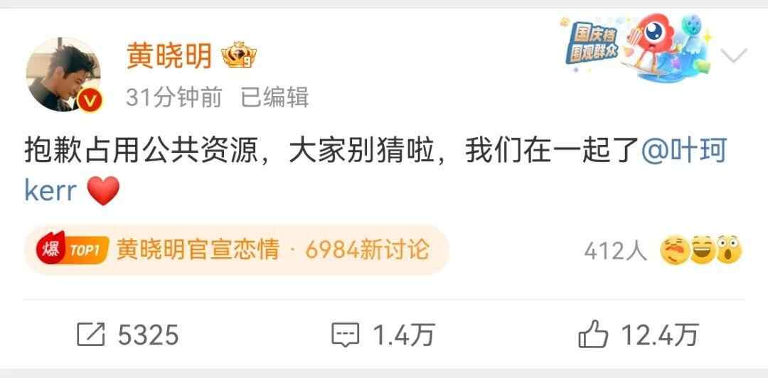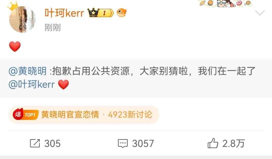 2024年9月19日,黄晓明正式宣布自己与叶珂恋情:抱歉占用公共资源,大家别猜啦,我们在一起了!