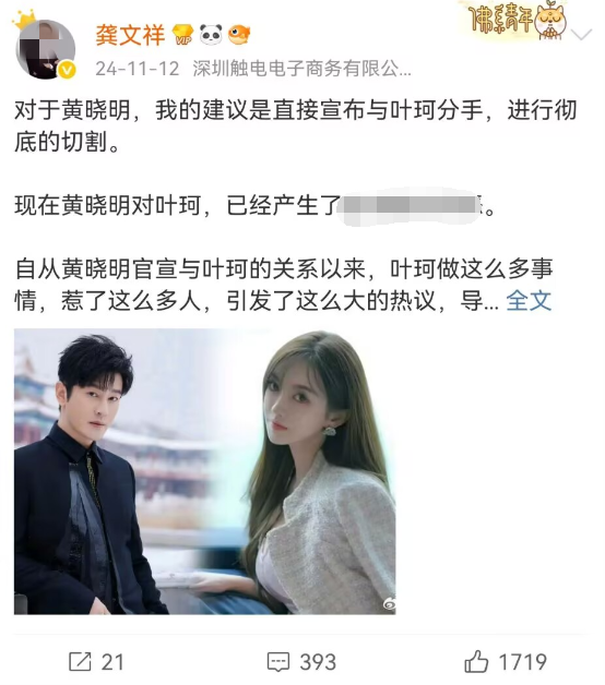 2024年11月28日,记者注意到,在黄晓明的个人账号中,9月19日官宣和叶珂在一起的微博已无法找到,有媒体称该微博已被删除。