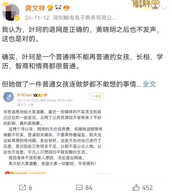 2024年11月10日,黄晓明女友叶珂发文回应近期传言,表示将退出网络。全文如下: