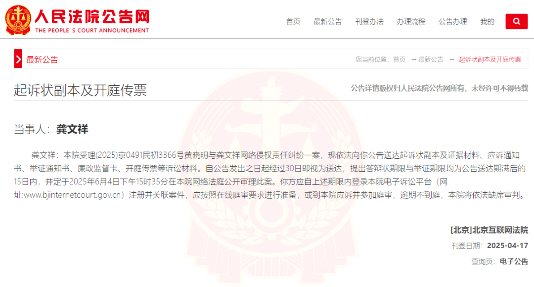 企查查APP显示,4月17日,法院送达黄晓明与自媒体博主龚文祥网络侵权责任纠纷起诉状副本及开庭传票,案件将于6月4日开庭审理。