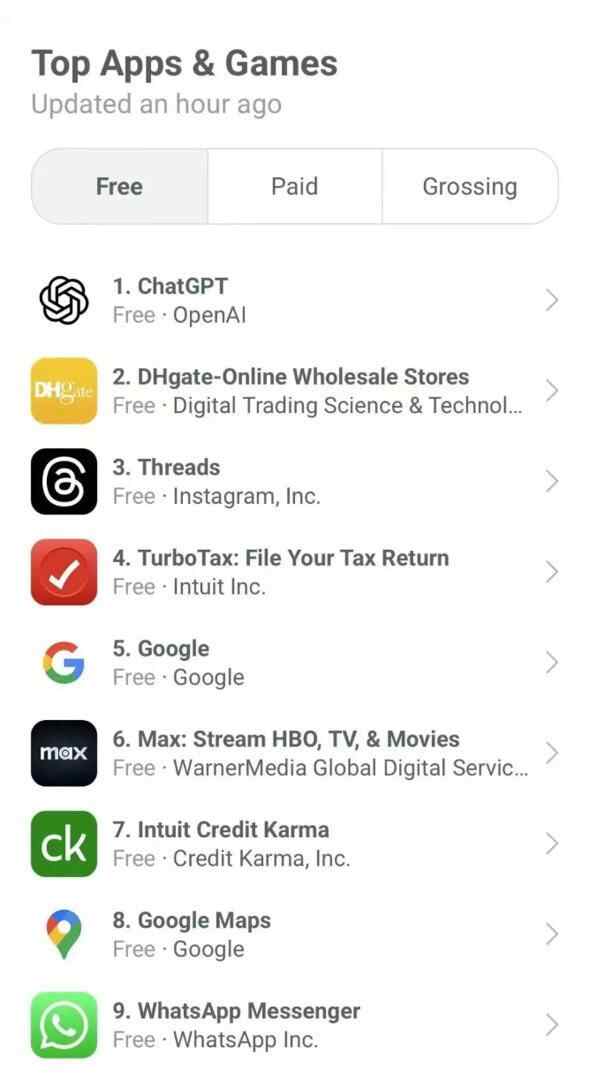 截至北京时间4月15日,敦煌网已在美区App Store免费iPhone应用程序排行榜中升至第二位,仅次于ChatGPT。这一成绩的取得,使其超越了Threads(Meta旗下社交软件)、TurboTax(报税软件)等知名应用。