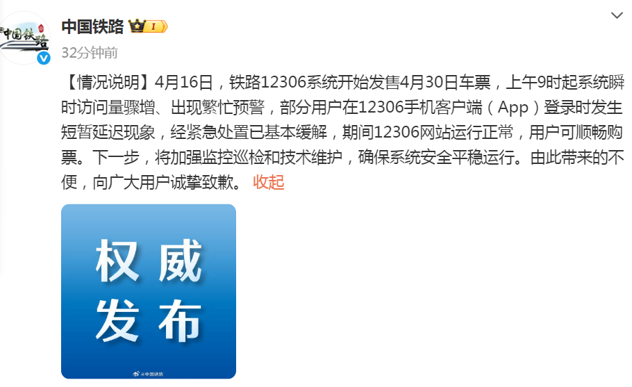 4月16日,@中国铁路发布一则情况说明,回应16日上午“12306崩了”的情况,全文如下: